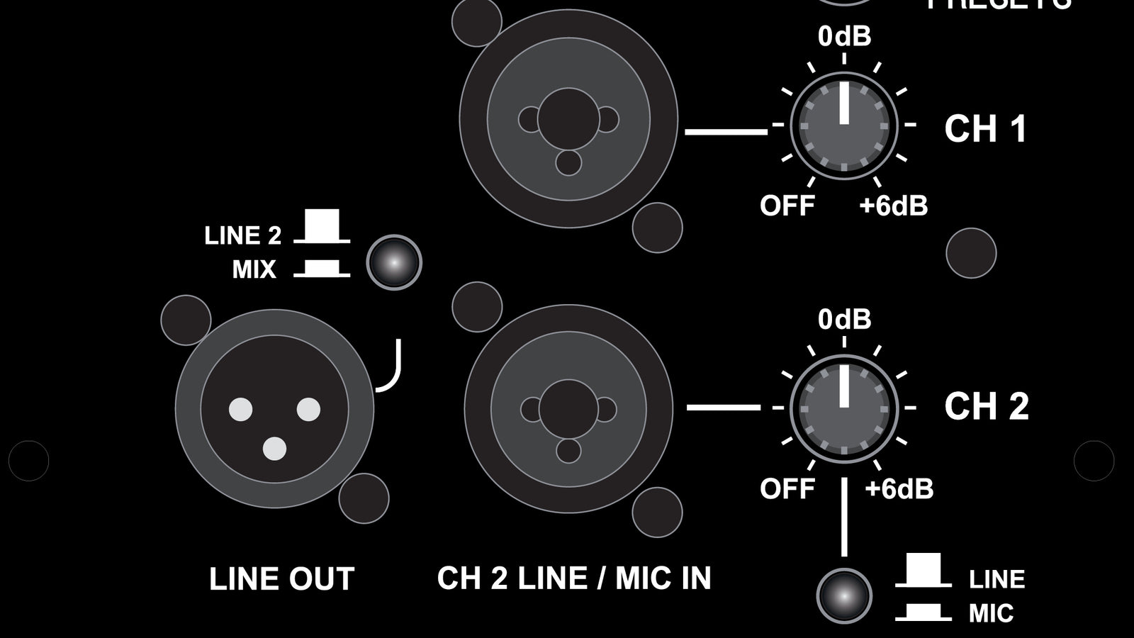 The SCx12A features a two channel mixer. For small gigs, you can plug directly into the speaker, adjust levels and you are ready to perform. Use theLINE/MIC button adjust for optimal gain of the intended input source. Select betweenLINE 2or theMIX signal to send audio to another loudspeaker via theLINE OUT.