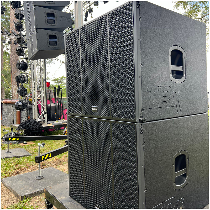 2 audio XLR connectors (female/male) daisy chain to all elements. Easy deployment for live events or installations comes from the multi-angle rear center bar that adjusts in 1º steps up to 10º. 4 to 16 elements per side are recommended for flying applications. Ground stack up to 4 elements on the TRx5118A for smaller venues.