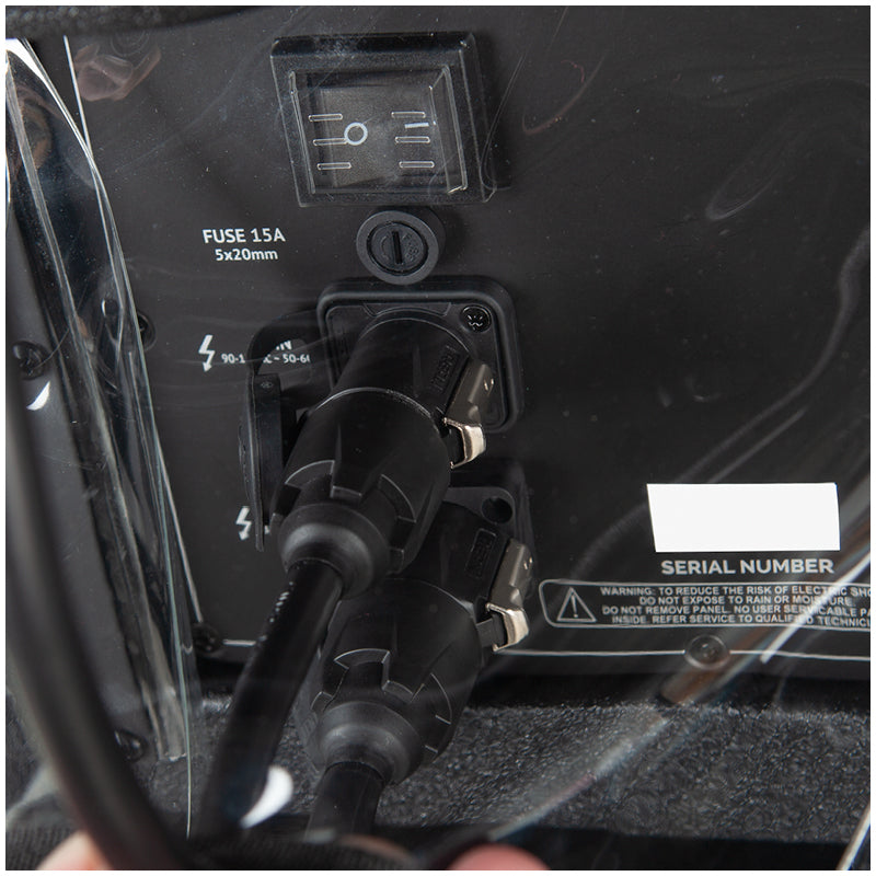 The powerful CLASS D 1000W & 550W amplifiers provide extra headroom. They are 97% efficient, allowing up to 4 elements per 120VAC 20A circuit. 2 female/male AC POWERX IP65 rated weather connectors daisy chain up to 4 elements to one 20A 120VAC circuit.